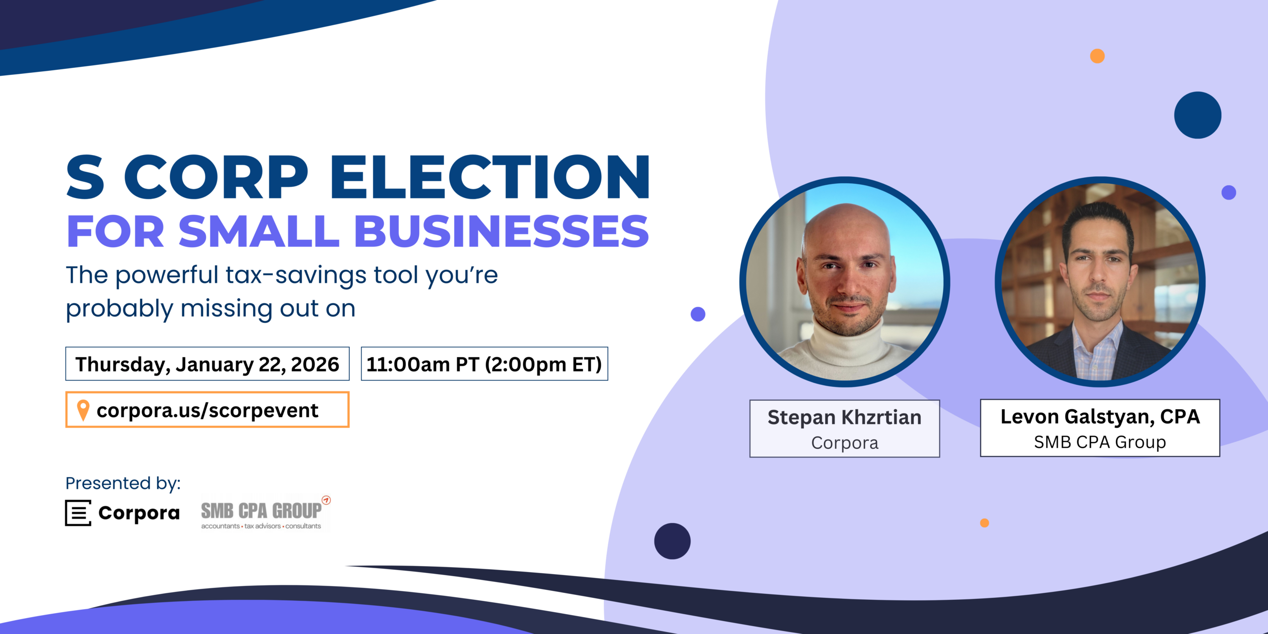 Join in as Levon Galstyan, CPA, Managing Principal at SMB CPA Group, and Stepan Khzrtian, co-founder and CEO of Corpora, sit down to cover the essentials of the S Corp, including topics such as: